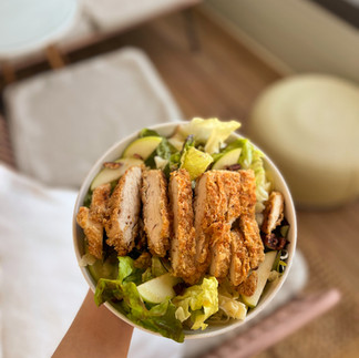 Chicken and Easy Mixed Green Salad Green Apple, Pecans, White cheddar, With Apple Cider Dijon Dressing Sweet Potato "Fries"